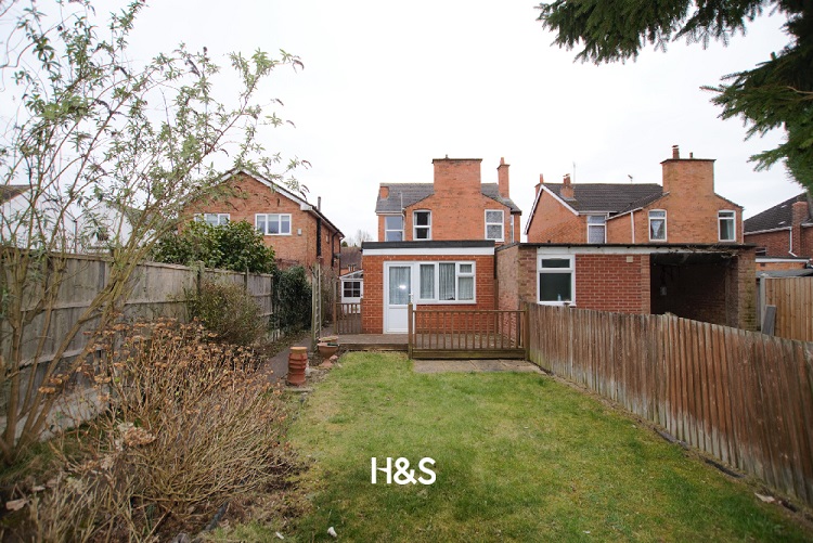 A large private rear garden with a decking area, large patio and a long lawn with fencing to boundaries. There is also access to the garage.