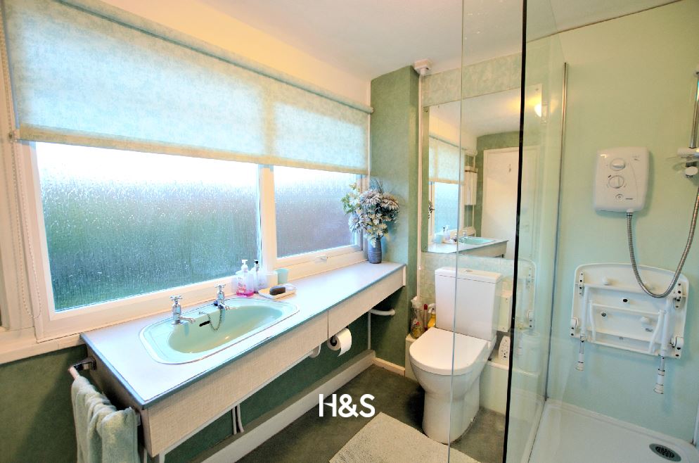 The suite comprises of a large walk in shower unit, wc and a sink. There is an airing cupboard, central heating radiator and an obscure double glazed window to the rear elevation