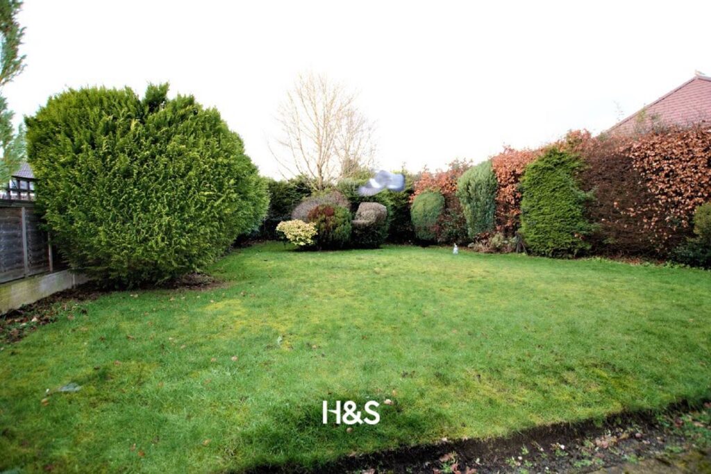 A pleasant private rear garden with a slabbed patio area that leads to a lawn which is bordered with tasteful mature shrubs and bushes.