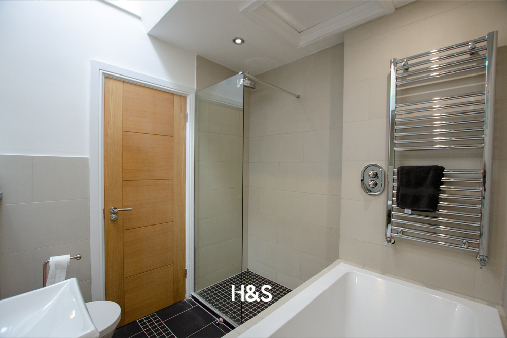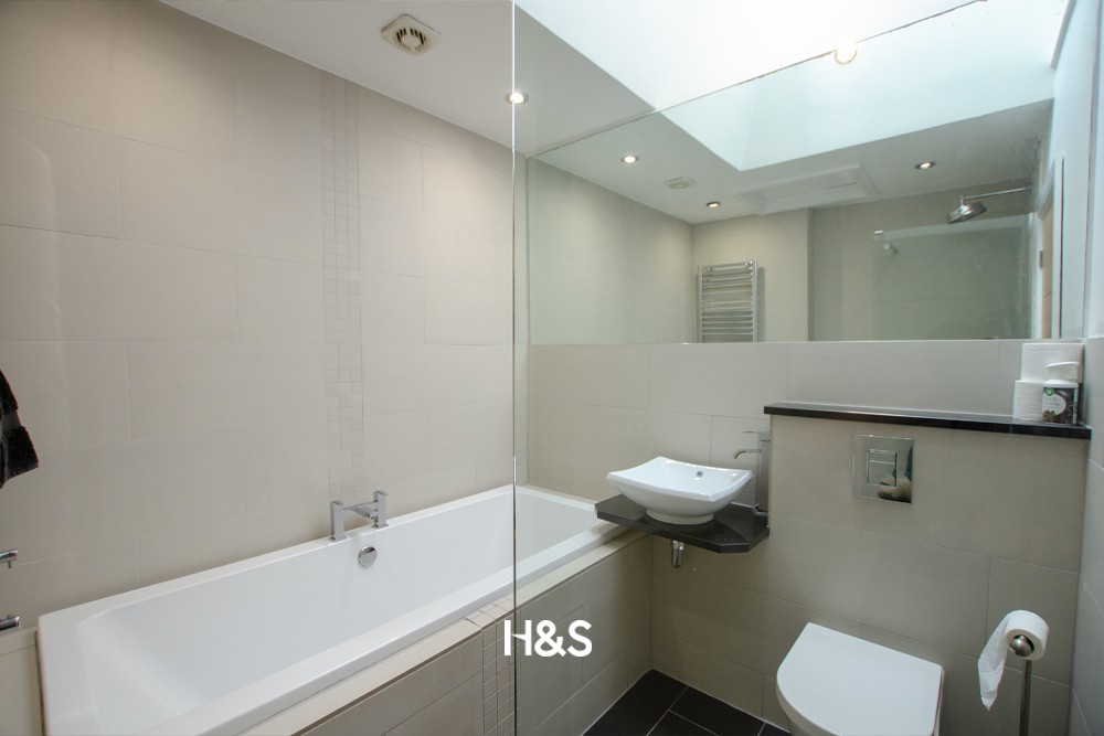 At the centre of the home is located the bathroom. The suite comprises of a sink with mixer tap, a bath with mixer tap, a tiled walk in shower cubicle with glass shower screen and heated towel rail. The bathroom boasts a double glazed ceiling window to which coupled with the large mirrored wall provides natural light to the room;