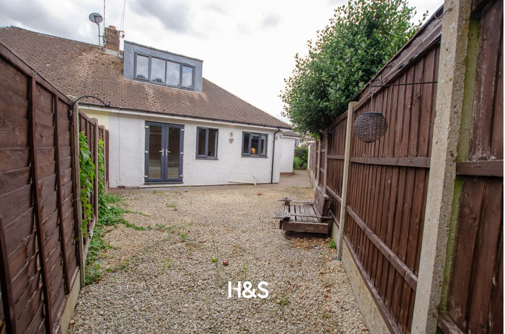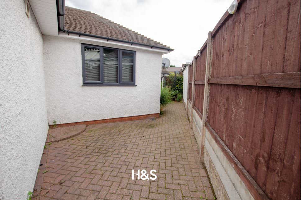 The rear garden flows around the left hand boundary at the property and is currently paved for ease of use. There are two areas of patio which can be used to grow potted plants or for socialising. The plot narrows behind the garage leading to a gate which provides access to the front of the property and a double glazed door to the garage.