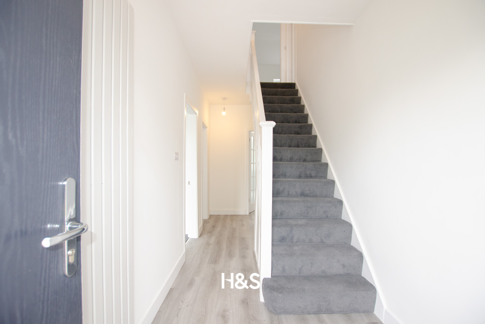 A welcoming entrance hall with stairs leading to the first floor landing, doors to the ground floor rooms and a central heating radiator.