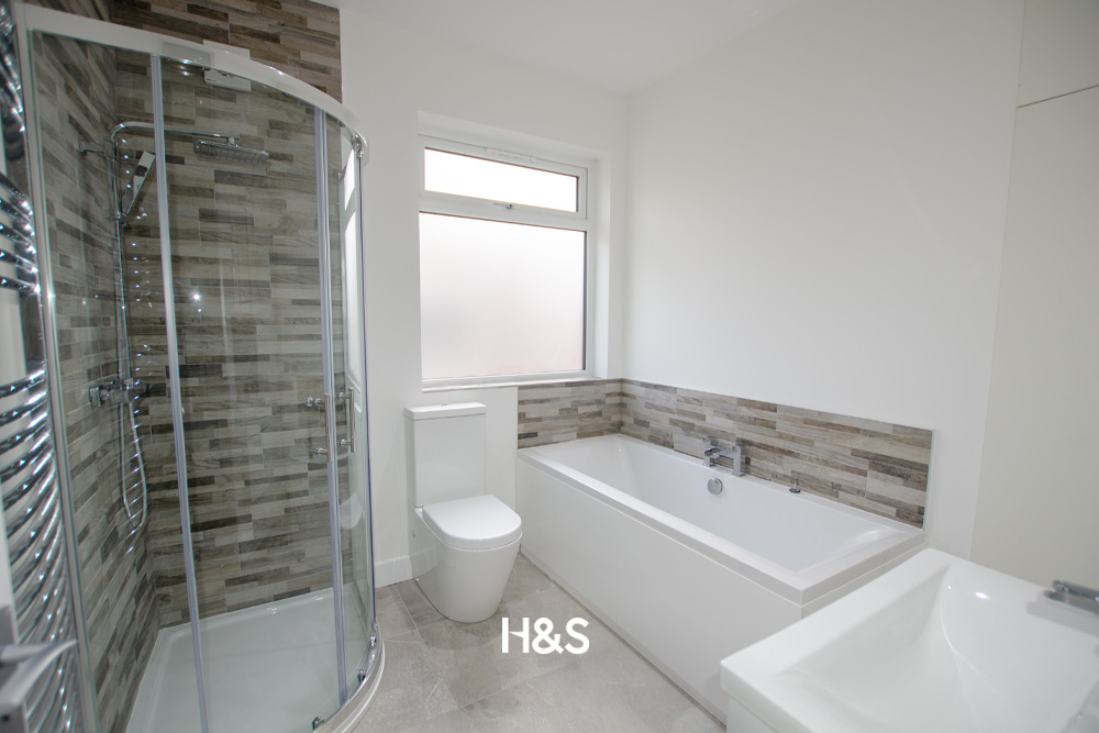 A four piece bathroom suite having a shower cubicle, panelled bath, sink and a low level wc. There is a built in storage cupboard, central heating radiator, a double glazed window to the side elevation and tiling to splash prone areas.