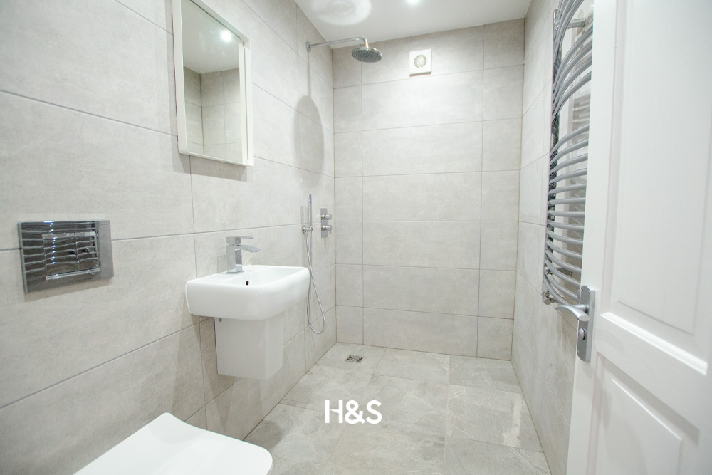A fully tiled room that benefits from a suite comprising of a low level wc, shower, and a sink. There is under floor heating and an extractor fan.