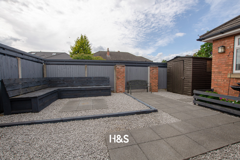 A standout feature of this property is the large wraparound garden to the side and rear. It includes a paved patio seating area, a well-maintained lawn, a garden shed, and double gates allowing secure off-road parking from the front of the property.