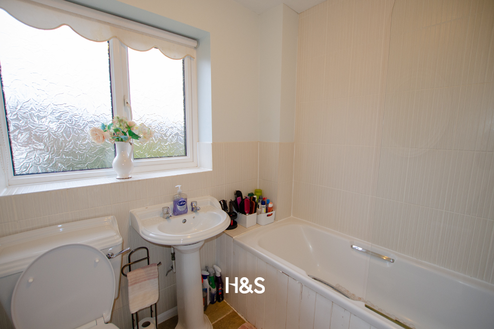 The suite comprises of a panelled bath with shower over, a sink, wc and a central heating radiator. There is tiling to splash prone areas and an obscure double glazed window to the rear elevation.