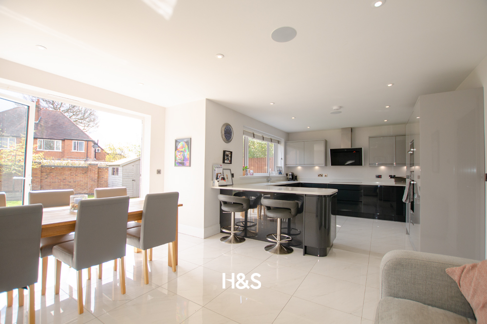 A fantastic open plan space set to the rear of the property that is perfect for entertaining and is the hub of the home. The kitchen area comprises of a range of modern high gloss wall and base units with down lighting and granite work surface over incorporating a stainless steel sink. The integrated NEFF appliances include an eye level electric oven and grill, an induction hob with extractor hood above, dishwasher and fridge/freezer. There is under under floor heating, Amtico flooring, a breakfast bar with seating, bi-folding doors giving access to the rear garden, a double glazed window to rear elevation and a door leading to the utility room.
