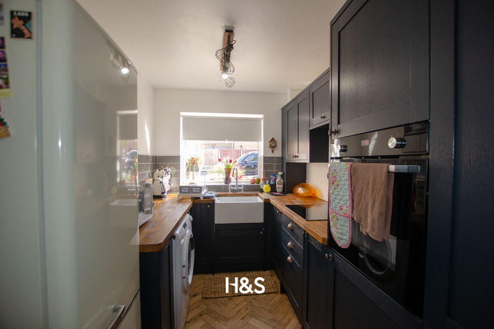 Range of base and wall units with complementary wooden worktops. Electric hob and eye-level oven with extractor, space for washing machine and fridge freezer and a double glazed window to front.