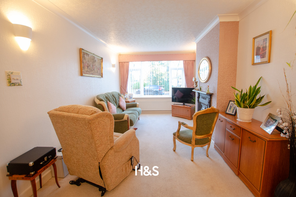 A bright and airy lounge with a window to the front and a door to the rear leading to the conservatory, a feature fireplace with fire and two central heating radiators;
