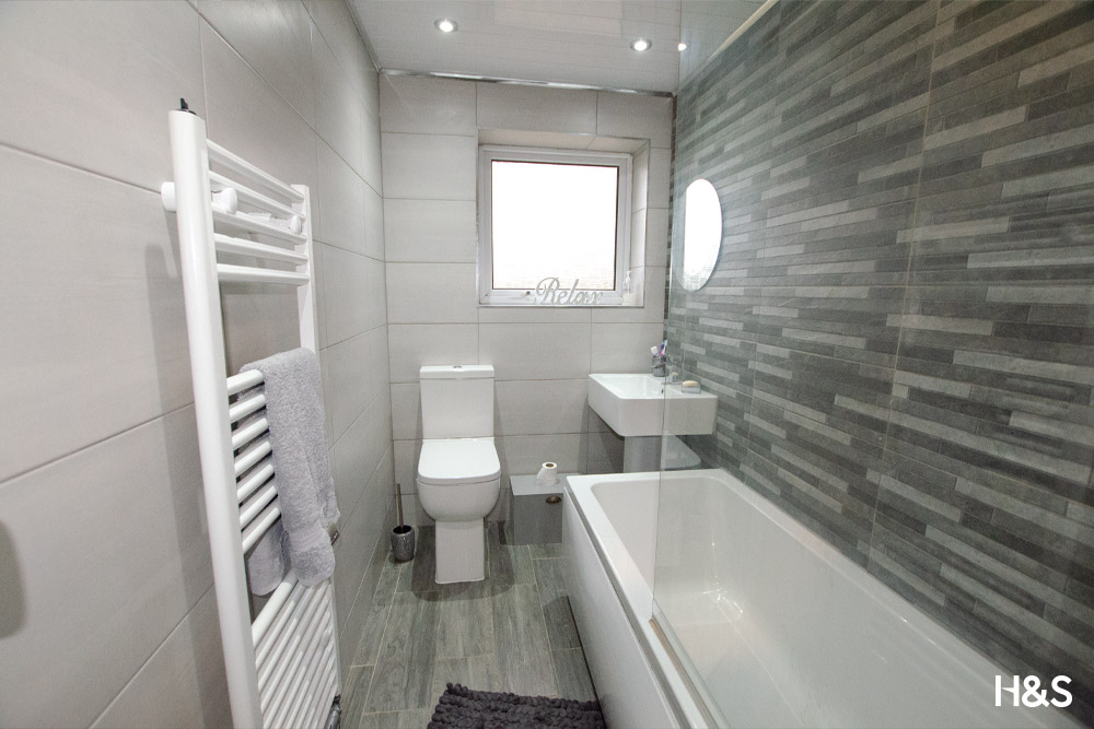 This recently refitted bathroom comprises of a low level wc, sink, panelled bath with shower over, heated towel rail, tiling to the walls and floor. There is also an obscure double glazed window to the rear elevation.