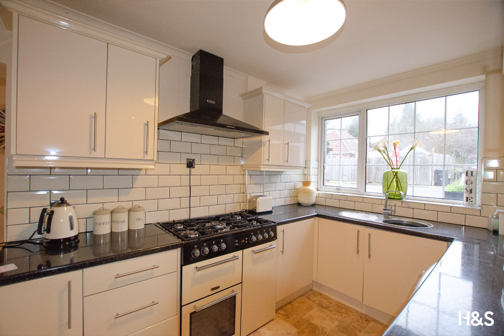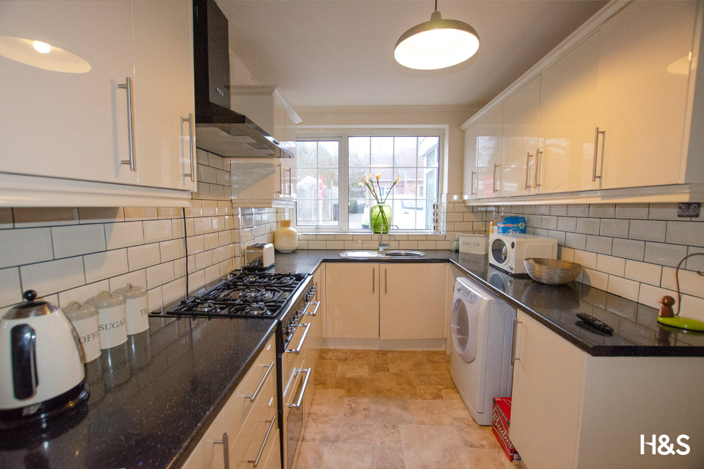 This modern kitchen comprises of a range of wall and floor base units, inset sink with mixer tap, plumbing for a washing machine, space for a freestanding range oven with extractor over and a double glazed window to the front elevation. There is a central heating radiator, a service hatch and an opening leading to the dining room.
