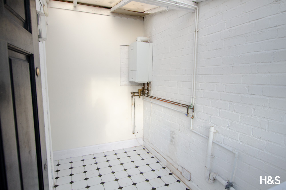 Wall mounted central heating boiler and door to rear garden.