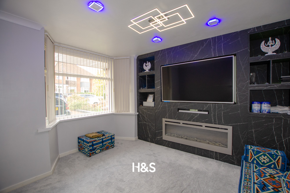 A large lounge to the rear of the property with a set of patio doors leading to the rear garden and a feature fireplace.