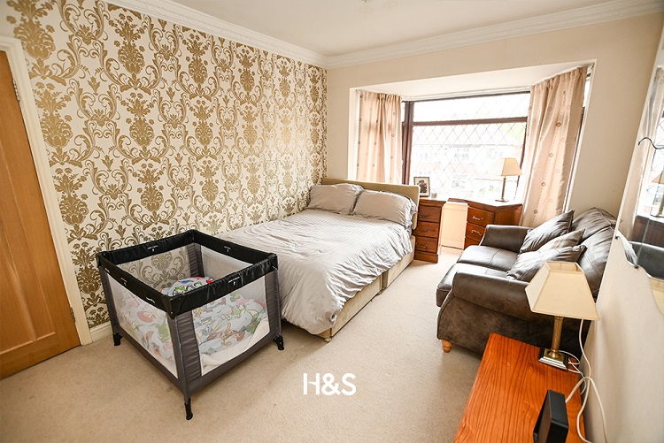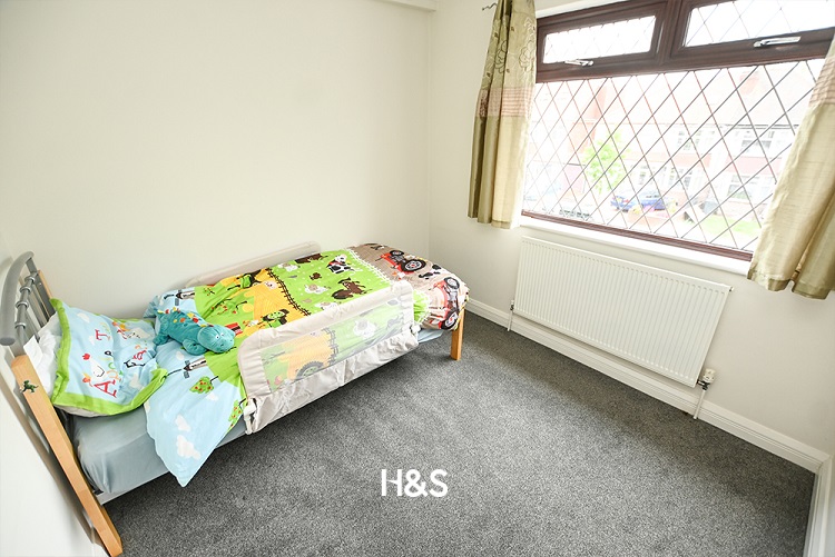 A double bedroom with a double glazed bay window to the front and a central heating radiator.
