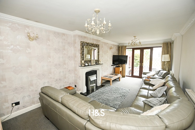 This room has been extended and is being used a lounge, there is a fireplace with fire, a set of double glazed patio doors leading onto the rear patio and two central heating radiators.