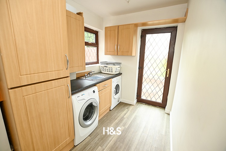 A useful room with wall and floor base units incorporating a washing machine and tumble dryer. There is a door to the garden and a door to the garage.
