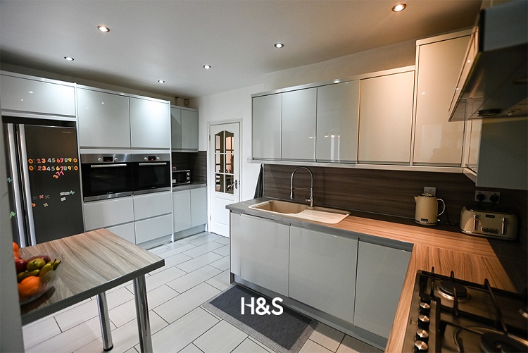 An immaculate kitchen that comprises of a range of modern, high gloss, handle-less wall sink with mixer tap. The integrated appliances are all ‘Bosch’ and include a double oven, dishwasher and a range cooker. There is tiling to the floor and a door to the garden.