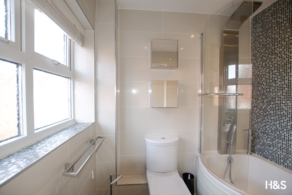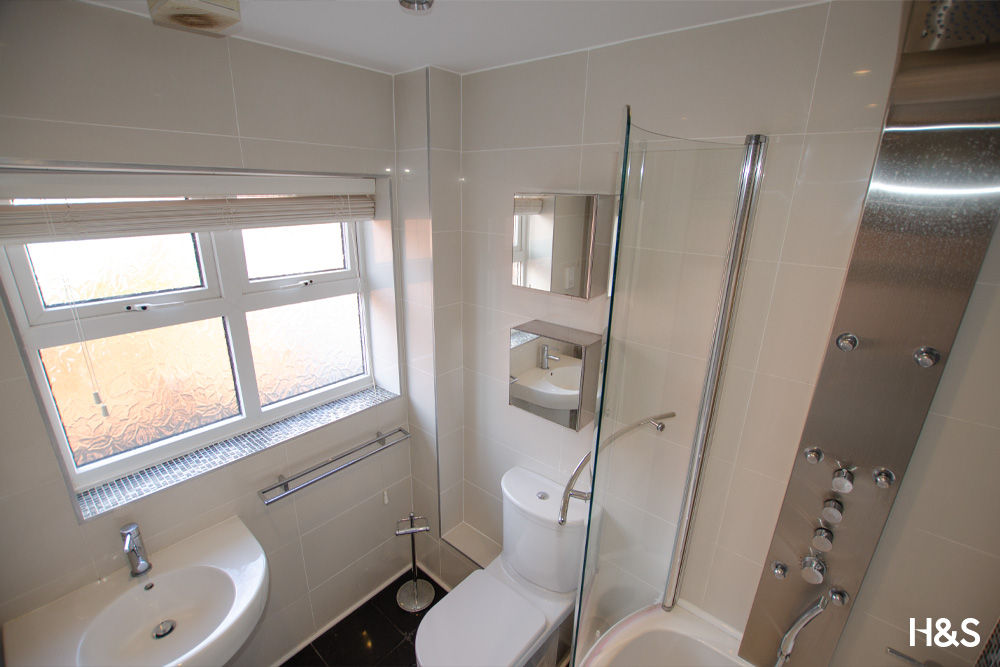 A fully tiled bathroom with an obscure double glazed window to the rear elevation and a central heating radiator. The suite comprises of a low level flush wc, a sink with mixer tap, a ‘P shaped’ bath with fitted power shower over.