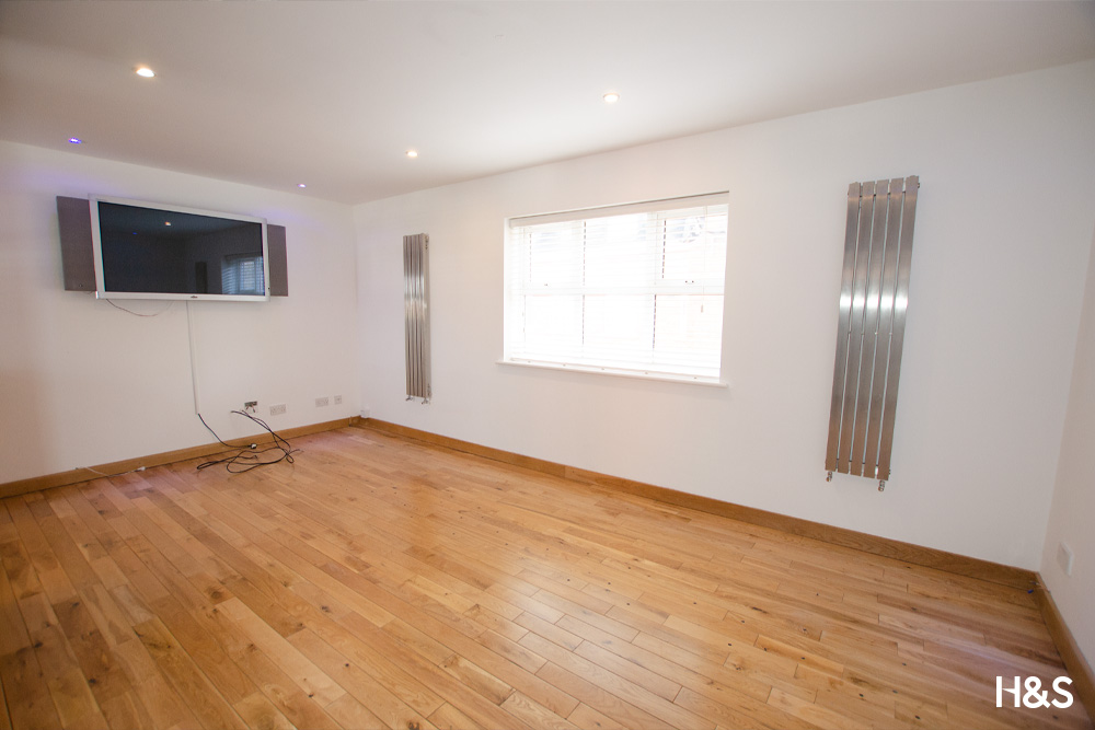 A large and bright lounge with a double glazed window to the front elevation, two chrome wall mounted vertical panel central heating radiators, spotlights to the ceiling and an opening on to the kitchen.
