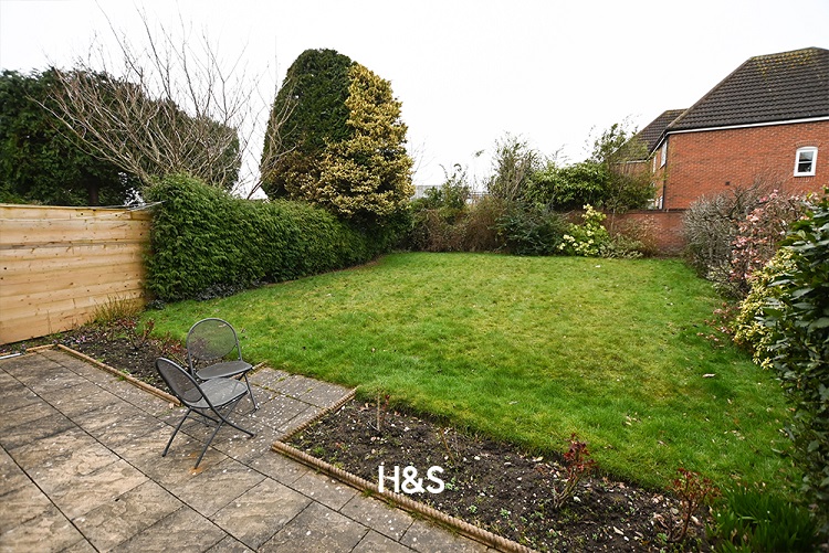 The private rear garden is a great space for children to play or for outdoor dining and entertaining. The garden features a slabbed patio area leading to a lawn with mature shrubs and bushes to borders, fencing to the side, and a wall to the rear.