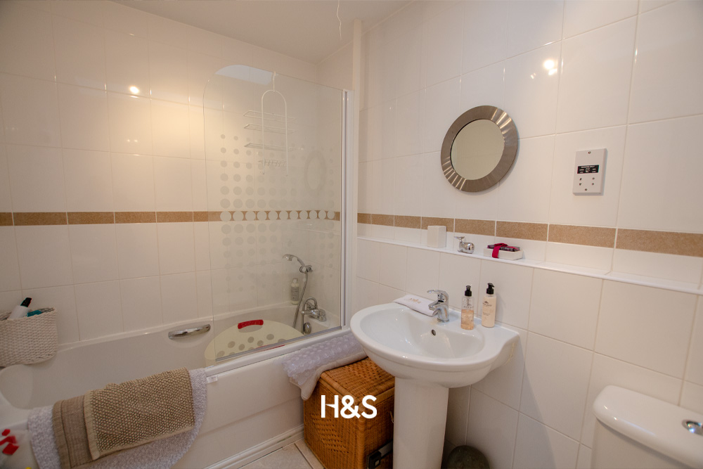 A fully tiled bathroom with the suite comprising a panelled bath with shower over, wc and a sink.