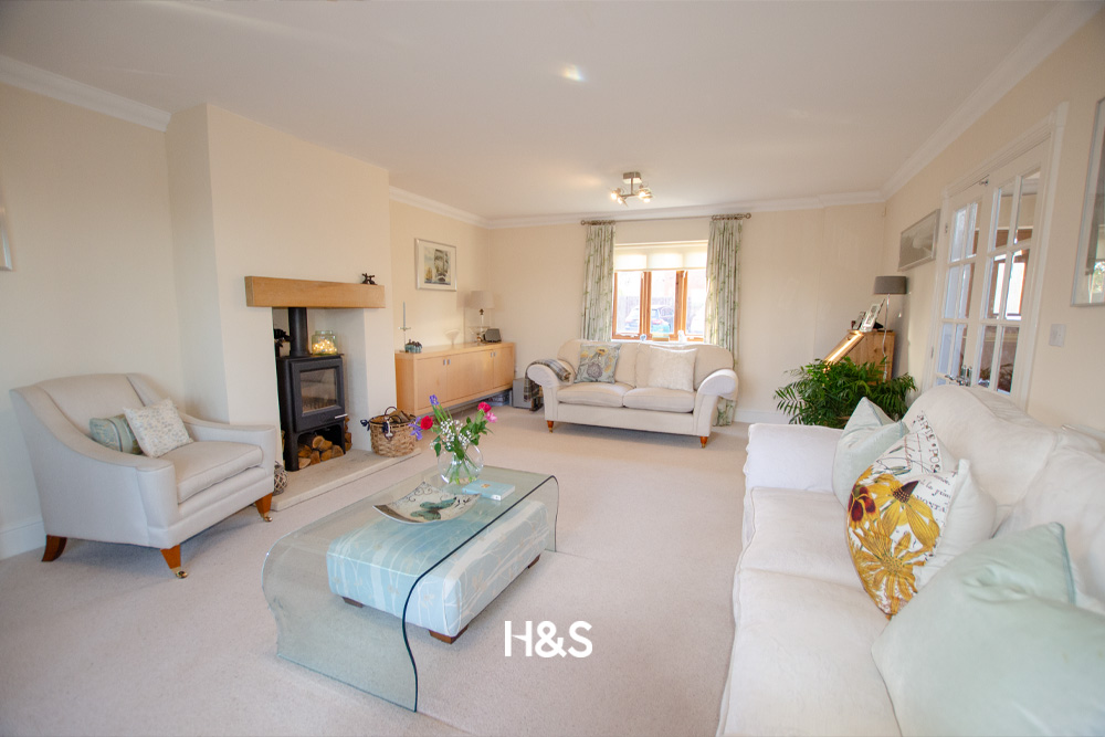 A bright and airy lounge with a double glazed window to the front elevation, a feature wood burner stove, a central heating radiator and double doors leading to the sun room.