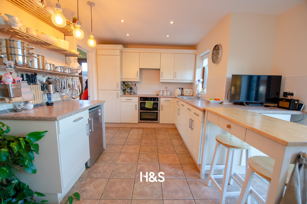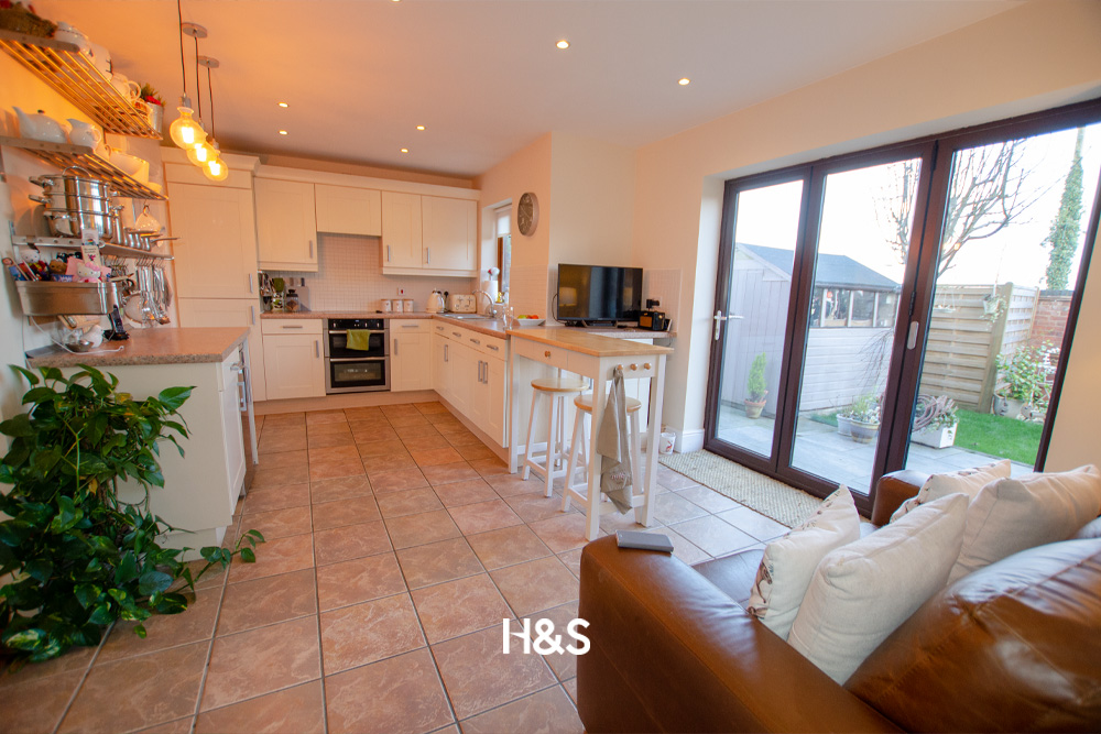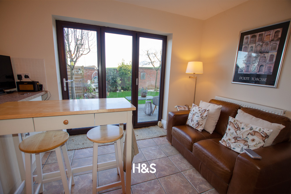 A perfect space for entertaining, comprising of a range of wall and floor base units, roll top work surface with space for a breakfast bar over looking the garden, an inset sink with mixer tap, space for a fridge freezer and an integrated oven. There is a double glazed window to the rear elevation over looking the private rear garden, bi fold patio doors leading to the garden and tiling to the floor.