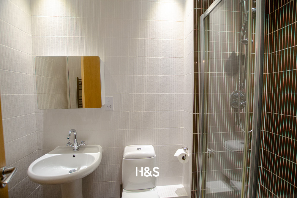 The suite comprises of a double shower, sink and wc with wall and floor tiling.