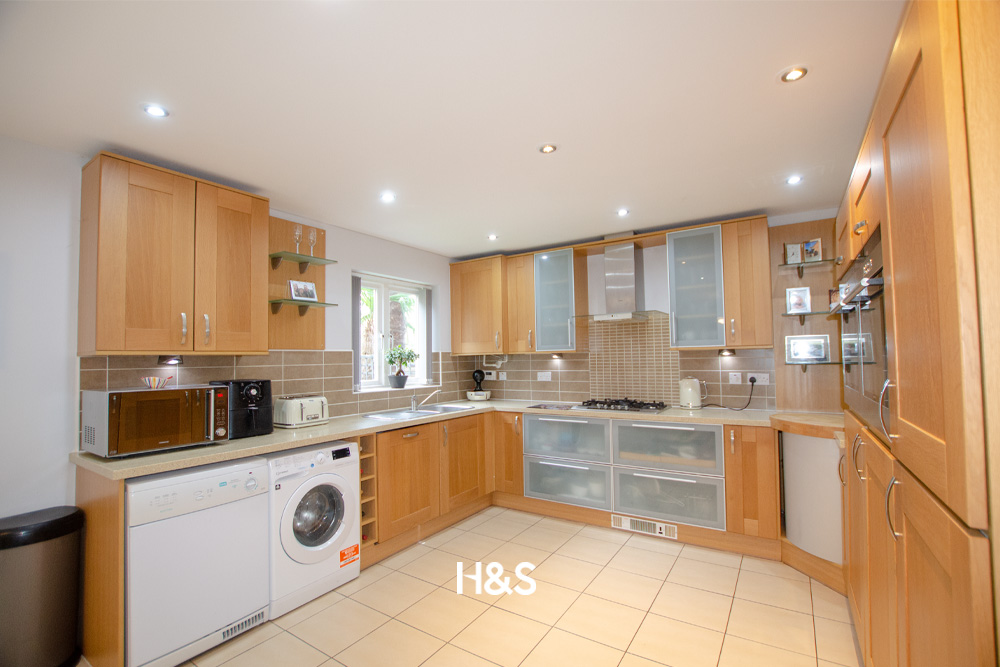 This fantastic space is perfect for large families and entertaining, it boasts a range of wall and base units with work surface over, incorporating a sink/drainer, there is integrated appliances to include; an electric double oven and gas hob, fridge/freezer and dishwasher. There is space for a washing machine and tumble dryer and door access to the rear garden and double glazed window to rear elevation.